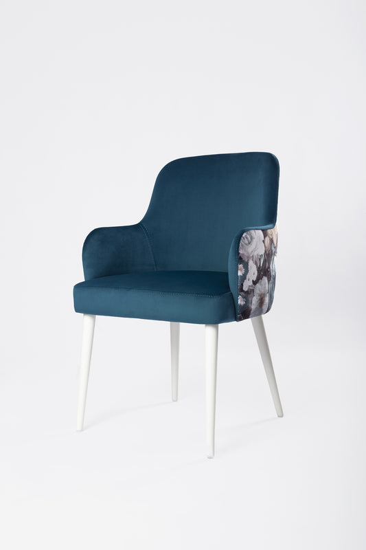 Cadeira estofada com opção de acabamento em verniz ou lacado branco mate. Outros acabamentos ou cores por orçamento.